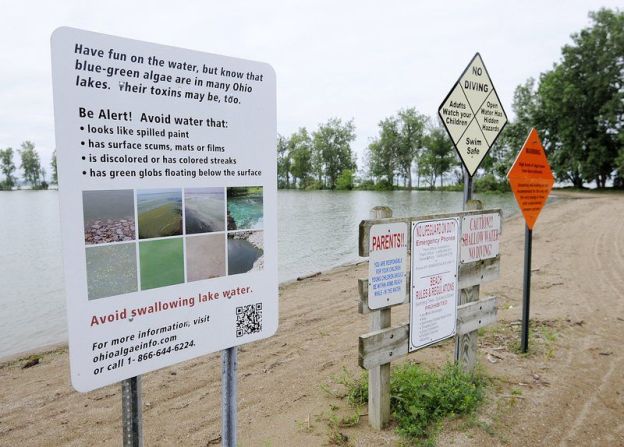 Signs posted around the Grand Lake, Ohio read: “Danger: Avoid all contact with the water.”  When dangerously high levels of toxins from blue-green algae in Grand Lake, Ohiio were publicized in 2009, many residents and tourists stopped using the 13,000-acre lake in northwest Ohio. Hotel revenue and home values sank for several years as algae bloomed in the state’s largest inland lake.