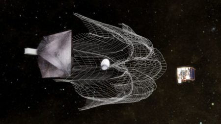“For this mission, we are actually ejecting our own little cubesats,” Jason Forshaw, RemoveDebris project manager at the University of Surrey, said last year. “These little cubesats are maybe the size of a shoebox, very small. We eject them and capture them with the net.”