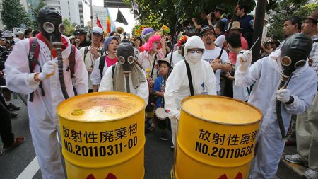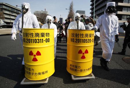 anti-nuclear protesters in Japan pushing fake nuclear waste