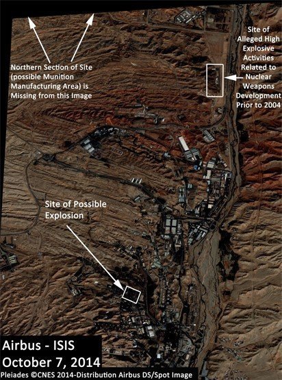 ISIS said its analysis of the satellite imagery from Oct. 7 and 8 indicated an explosion could have taken place at a southern section of Parchin.  “Several signatures that coincide with those expected from an explosion site are visible here,” it said on its website.  “Two buildings that were present in August 2014 are no longer there, while a third building appears to be severely damaged. In total at least six buildings appear damaged or destroyed,” ISIS added.