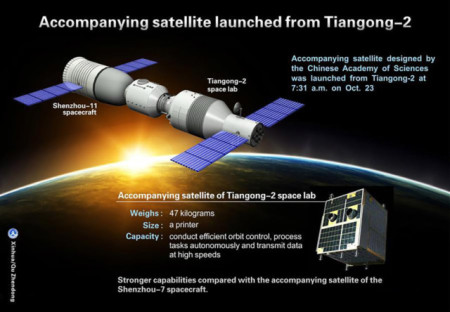 China’s experimental space lab Tiangong-2 orbiting the Earth with two astronauts on board has successfully launched a micro-satellite, roughly the size of a desktop printer. Weighing 47 kilogrammes, the micro satellite has a series of visible light cameras, including a 25 megapixel camera and wide-angle imagers. Its mission is to take photographs of Tiangong II and the Shenzhou 11 spacecraft, which docked with the lab on Wednesday.